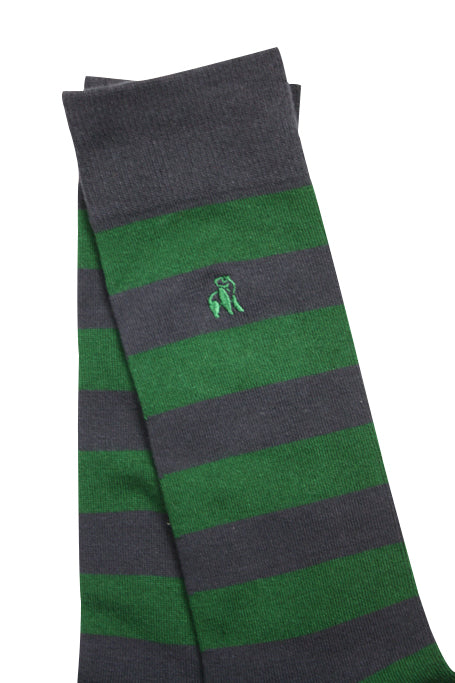 These racing green and navy striped Bamboo Socks by Swole Panda will compliment your outfit. They are knitted from a unique breathable bamboo blend creating an unbelievably soft and smooth feel. Featuring a reinforced heel and toe for durability as well as hand linked seams for added comfort.