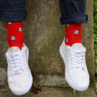 Red football Bamboo Socks by Swole Panda add a sporty vibe to your assemblage. Footballs feature on a plain red background. They are knitted from a unique breathable bamboo blend creating an unbelievably smooth snug feel. Featuring a reinforced heel and toe as well as hand linked seams for added comfort.