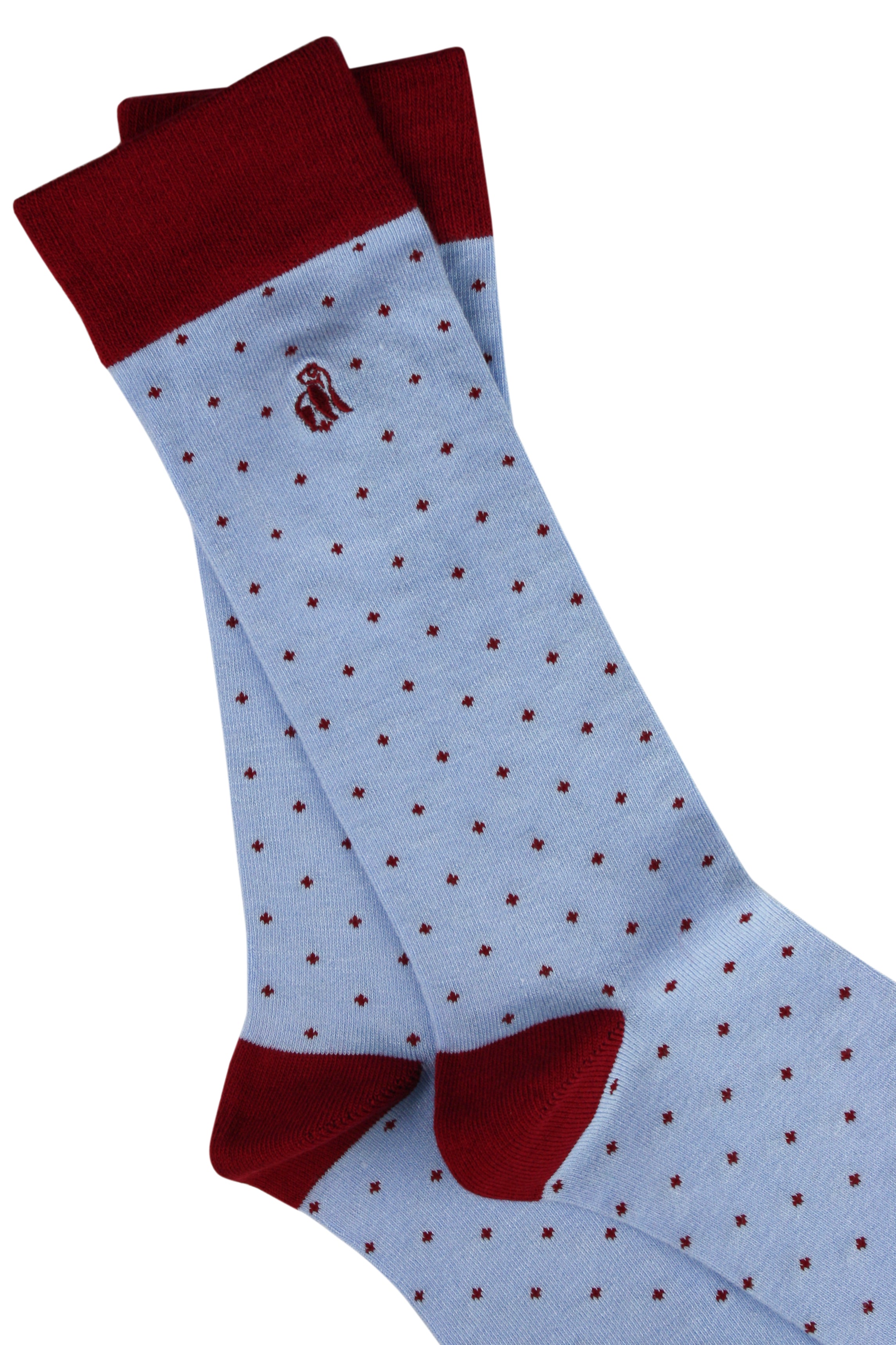 These spotted Bamboo Socks by Swole Panda are a wonderful combination of burgundy spots and a light blue canvas. A pair of classic socks that take spot socks to another level. They are knitted from a unique breathable bamboo blend creating an unbelievably smooth snug feel. Featuring a reinforced heel and toe as well as hand linked seams for added comfort.