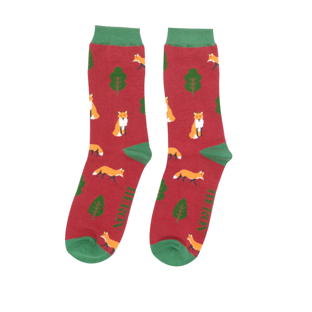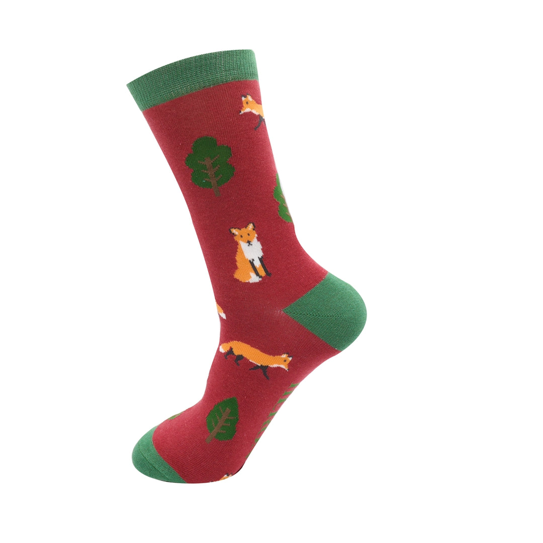 Fox in the Woods Bamboo Socks in Red by Mr Heron, Size UK 7-11