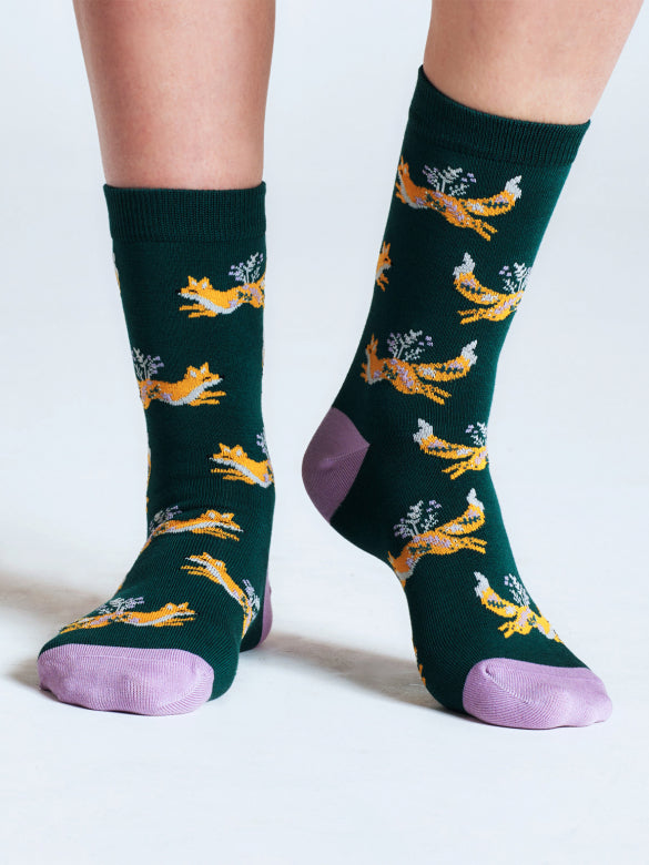 Bess Running Fox Bamboo Socks in Dark Green by Thought, Size 4-7