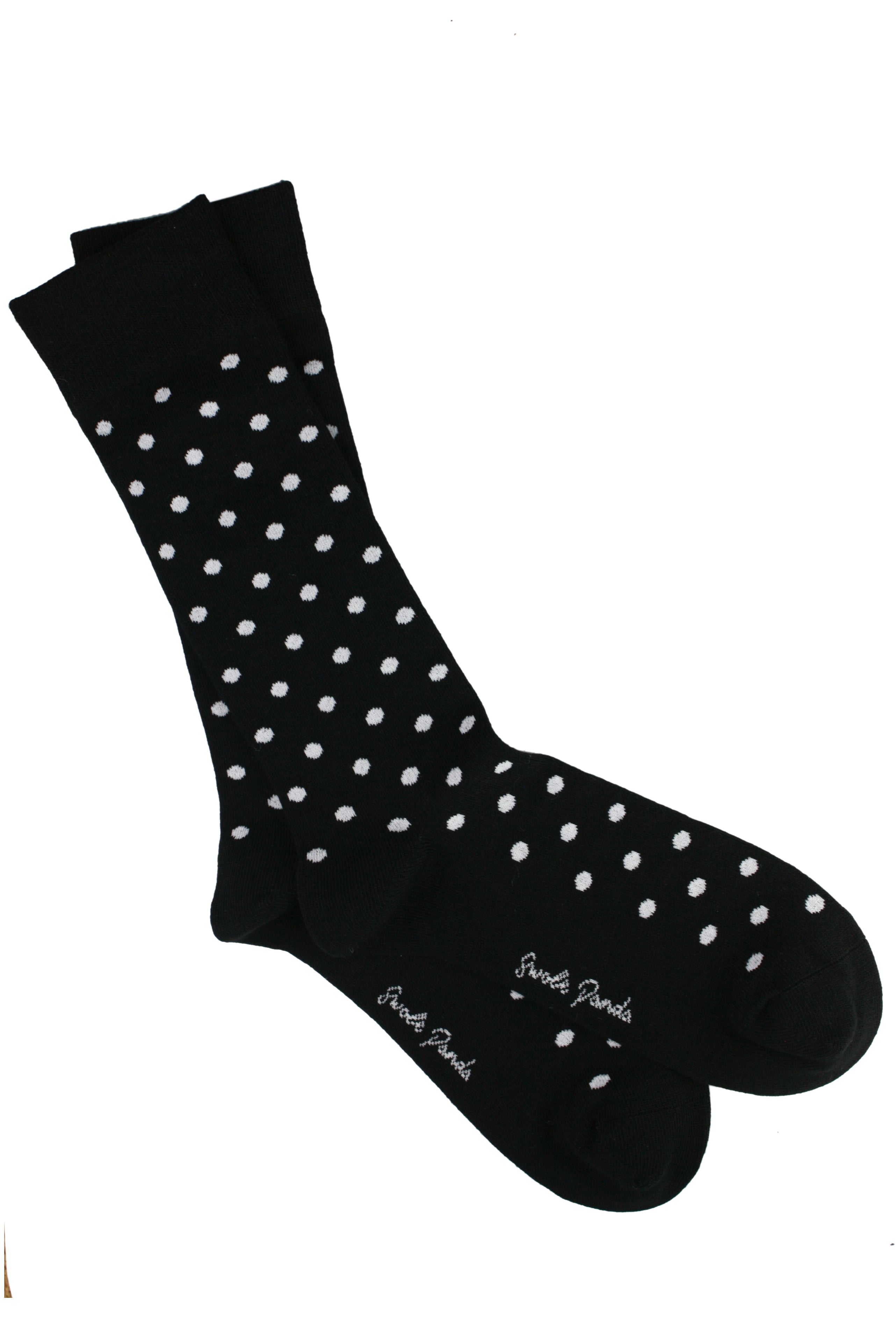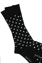 Black Polka Dot bamboo socks by Swole Panda. A striking twist on a wardrobe staple, a clever twist for the person seeking to add an elegant detail to a sophisticated outfit. Knitted from a unique breathable bamboo blend creating an unbelievably soft and smooth feel. Featuring a reinforced heel and toe for durability as well as hand linked seams for added comfort.