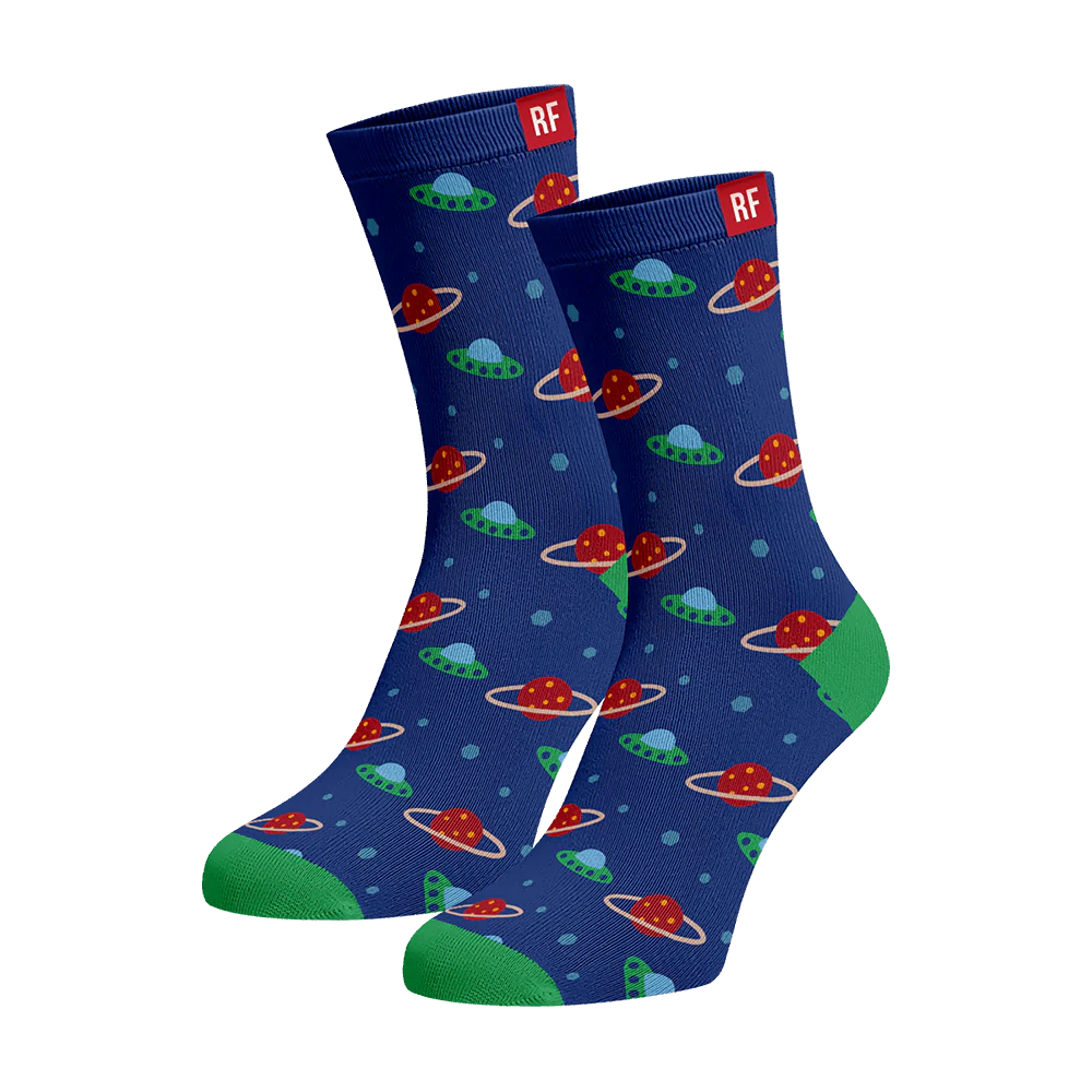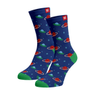Get ready to blast off with these dark blue socks that feature green and blue UFOs soaring through the sky amongst red and pink planets creating cosmic-wonders for your out of this world style. These socks are the perfect addition to any outfit, adding a pop of color and personality.