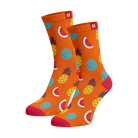 Escape to a tropical paradise with these bright orange socks that feature a burst of juicy  exotic fruits. These socks are versatile and can be worn with your favorite sneakers for a casual look, or wear them with sandals in the summer. The possibilities are endless with these versatile socks. They also make a great gift for anyone who loves a bold and unique fashion statement.
