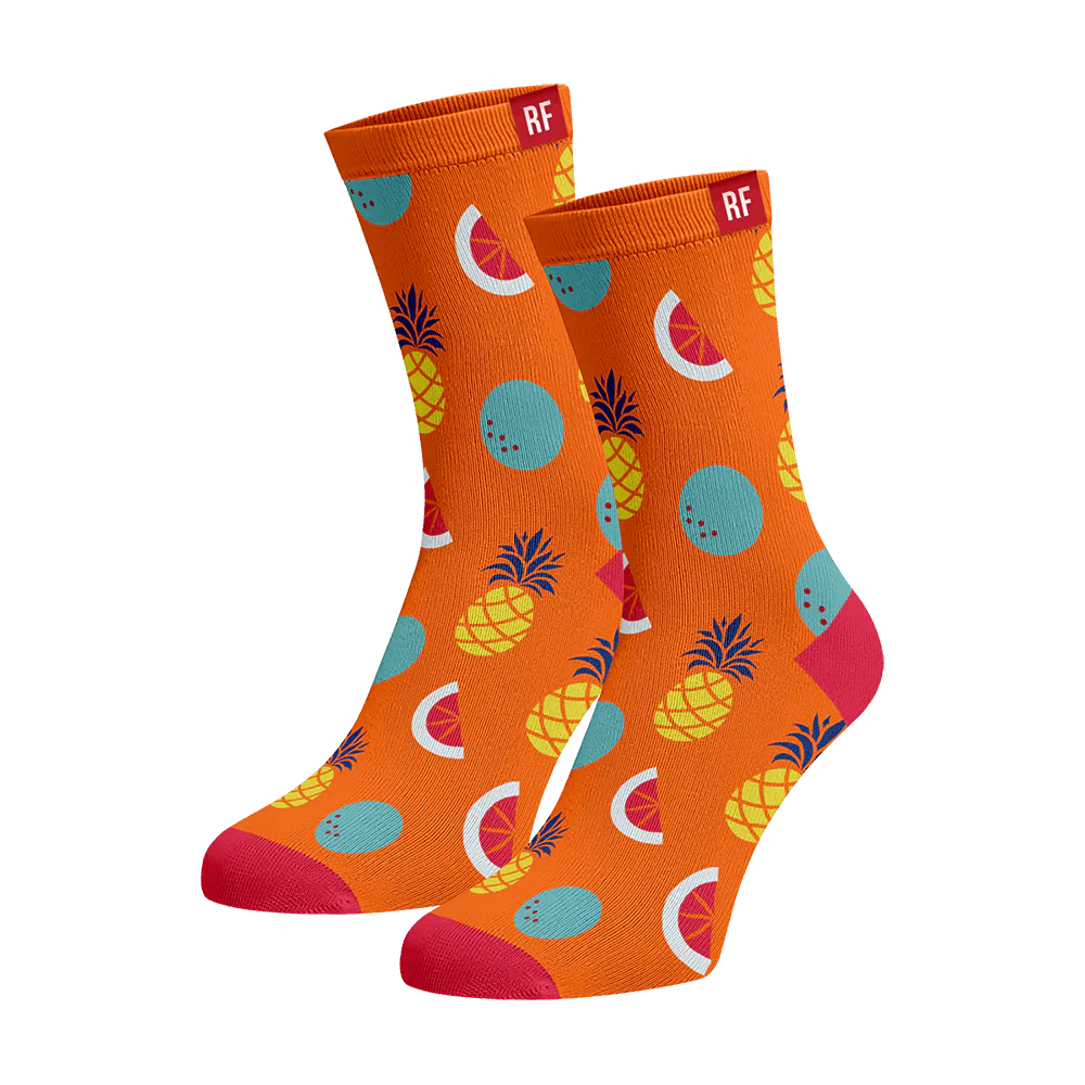 Playful orange socks with exotic fruits the perfect way to add a bit of fruity charm to your everyday outfit. The vibrant color will surely brighten up your day, the perfect accessory for anyone looking to add a pop of color and fun to their wardrobe.