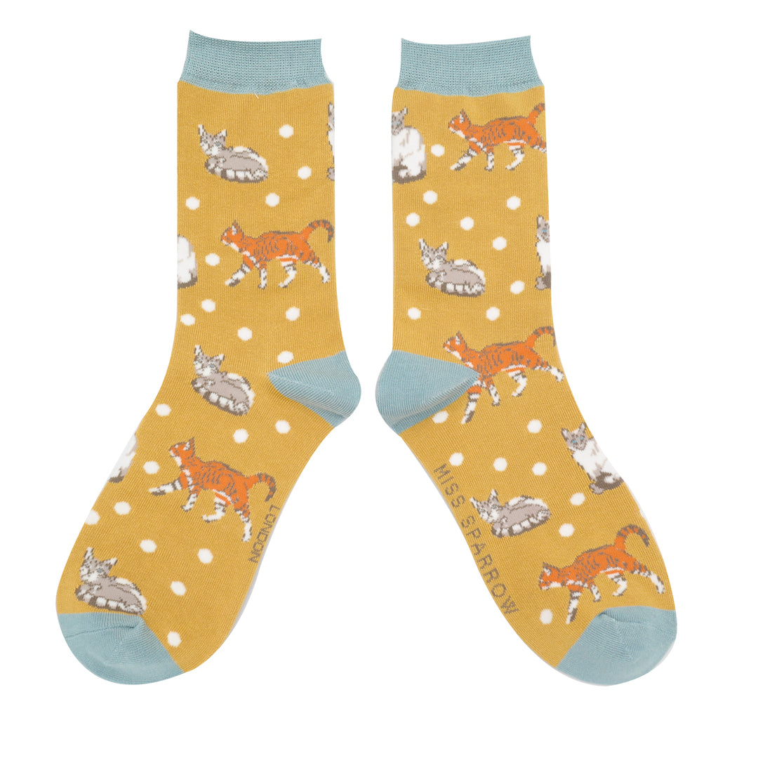 Cats and Spots Bamboo Socks in Mustard by Miss Sparrow