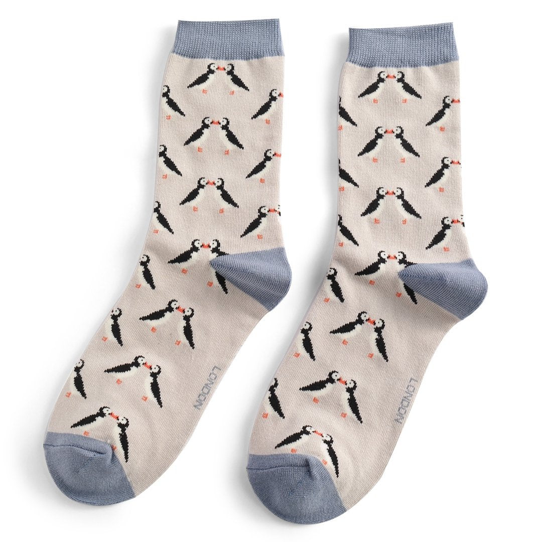 Kissing Puffins Bamboo Socks in Silver by Miss Sparrow, Size UK