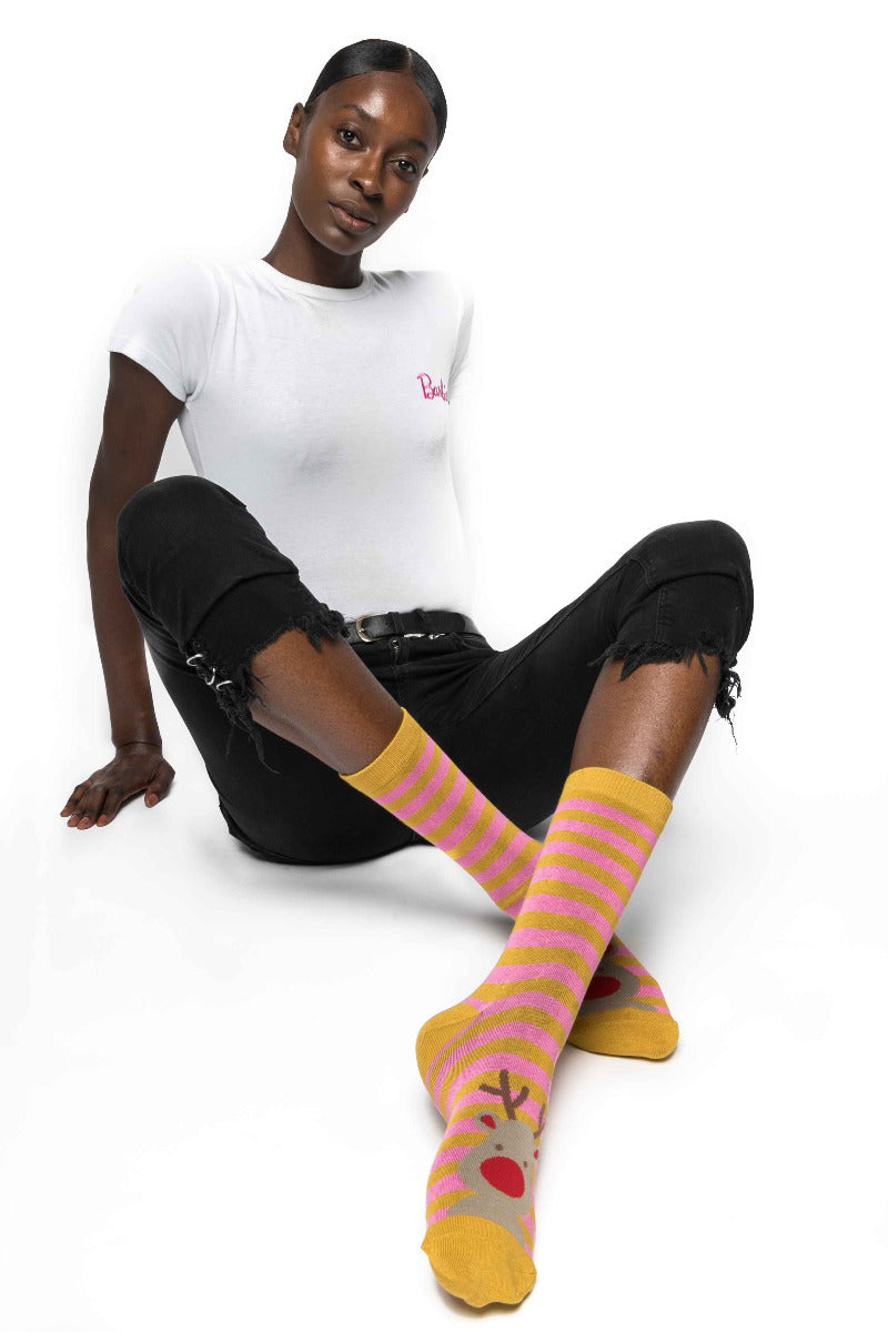 Raindeer print socks with a contrasting heel and toe. Crafted in an incredibly soft bamboo blend, these socks are breathable, naturally anti-bacterial and anti-fungal.