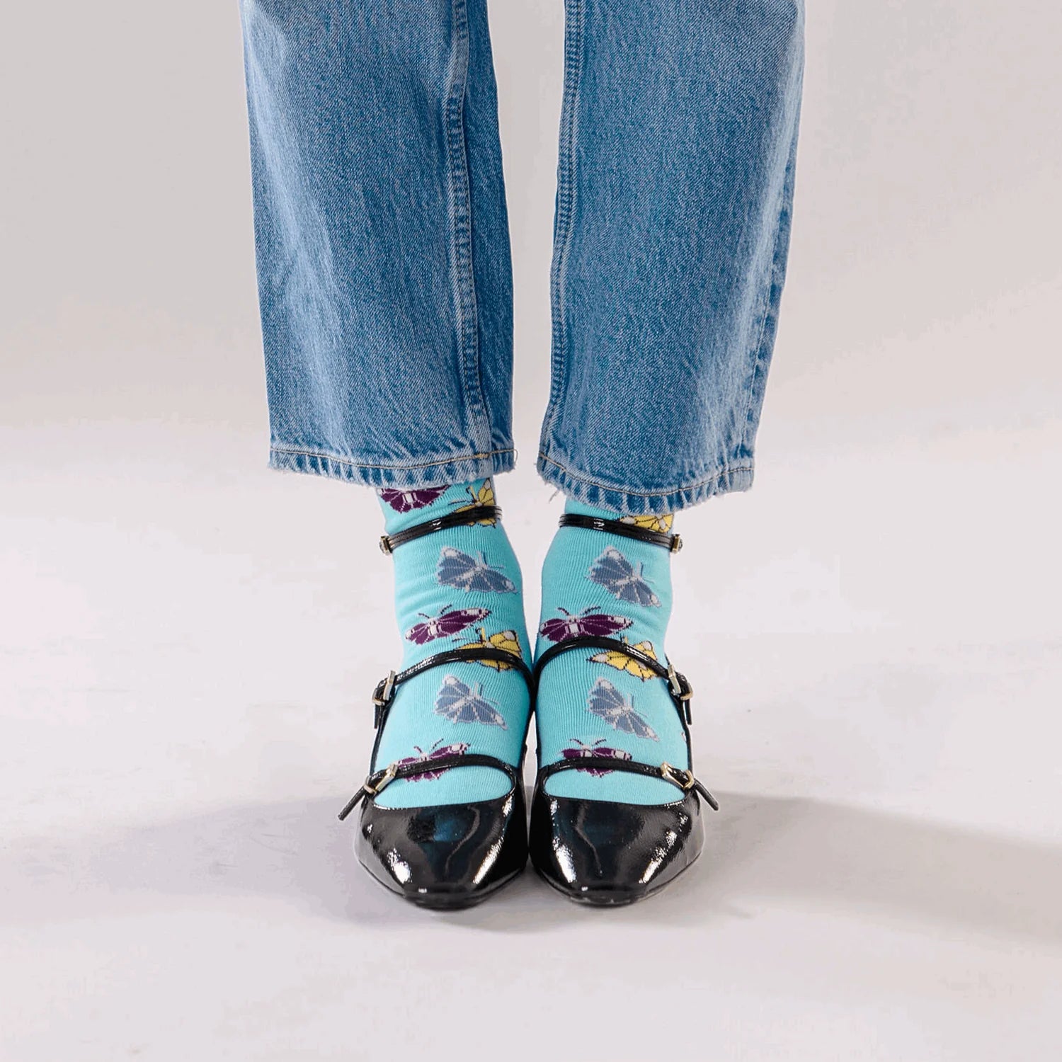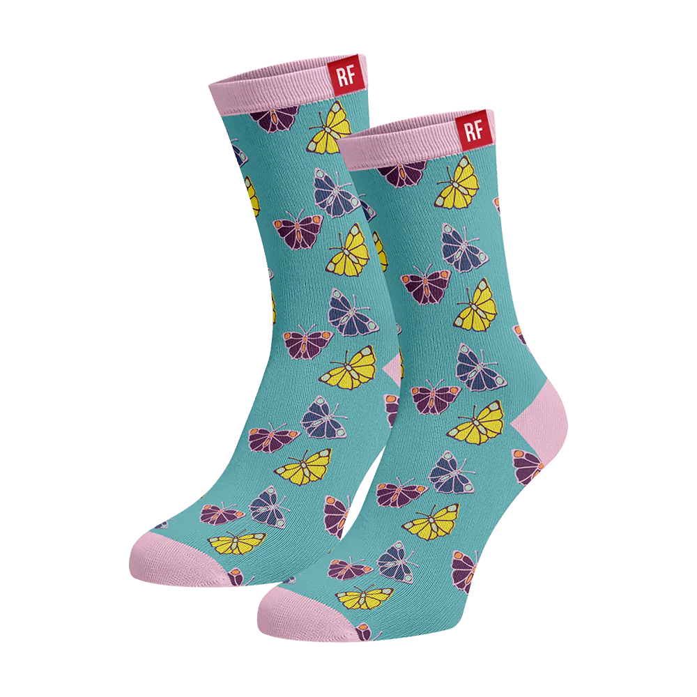 Butterfly - a charming addition to your sock wardrobe. These blue socks feature delicate butterfly designs, adding a touch of whimsy to any outfit. The butterfly designs on theses socks are intricately crafted, showcasing the beauty and grace of these creatures. A statemen sock that will elevate any ensemble.