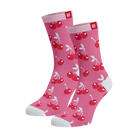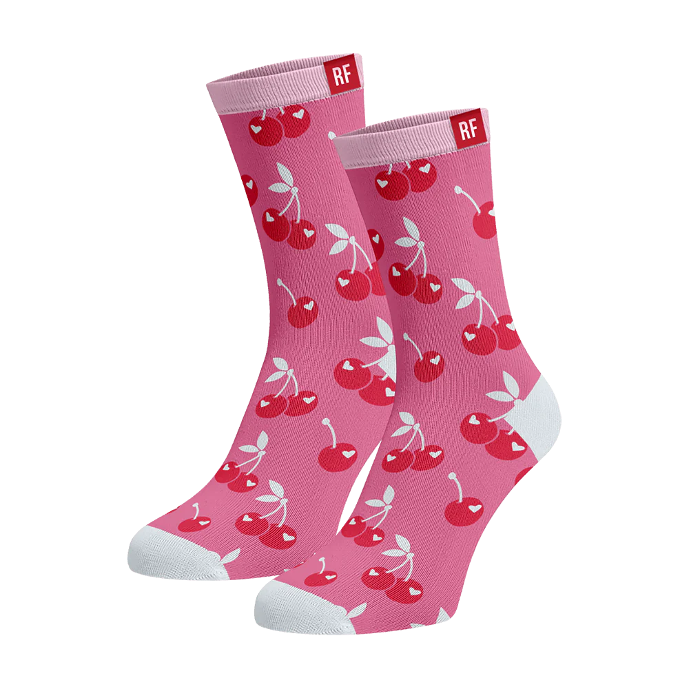 Playful pink socks with a red cherry, the perfect way to add a bit of fruity charm to your everyday outfit. The vibrant pink color will surely brighten up your day, while the red cherries add a fun and playful element.