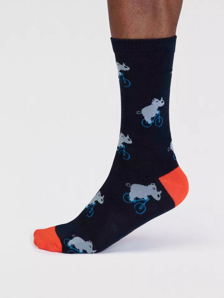 Animal on Bike Bamboo Socks in Navy by Thought, Size 7-11
