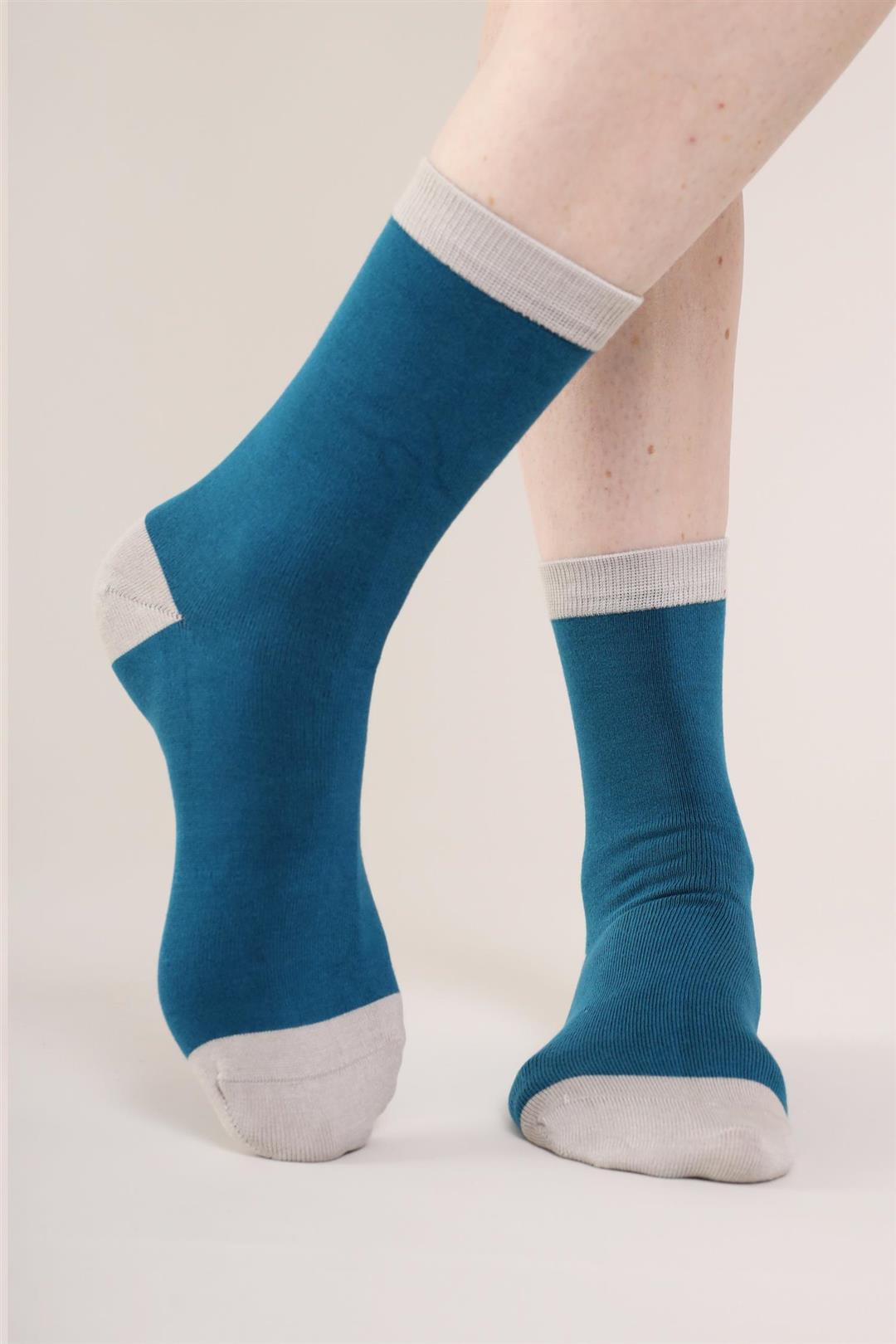 Introducing bamboo plain socks by Nomads, size 7-11. Made with sustainable and luxuriously soft bamboo, you'll experience breathability and naturally anti-bacterial and anti-fungal properties. These playful plain socks in lake blue feature a contrasting heel, toe, and cuff. Say goodbye to boring socks!